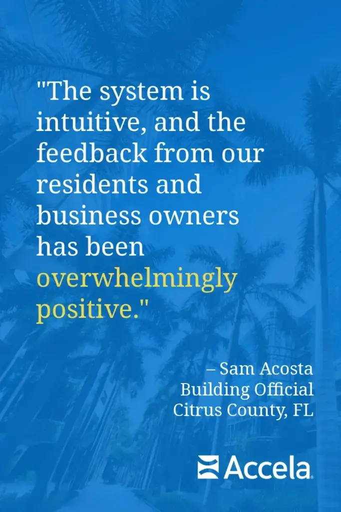 Sam Acosta, Building Official for Citrus County, echoed this sentiment: “We’ve been incredibly pleased with how smoothly our staff transitioned to Accela. The system is intuitive, and the feedback from our residents and business owners has been overwhelmingly positive. We’re proud of how well we’ve been able to roll this out to the community.”